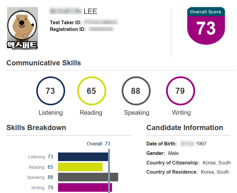 영어 점수: PTE Academic 오버롤 68 & 73 - 이치 점수는 합산으로 해결