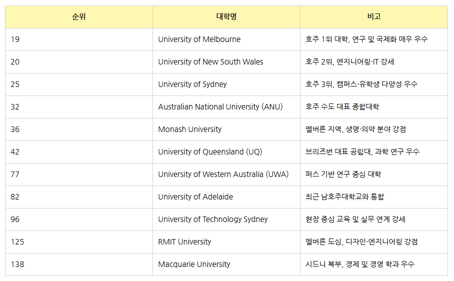 이처럼 호주 명문대는 학문적 성과와 실용성을 동시에 갖춘 교육기관으로서 전 세계 학생들에게 지속적으로 선택받고 있습니다.