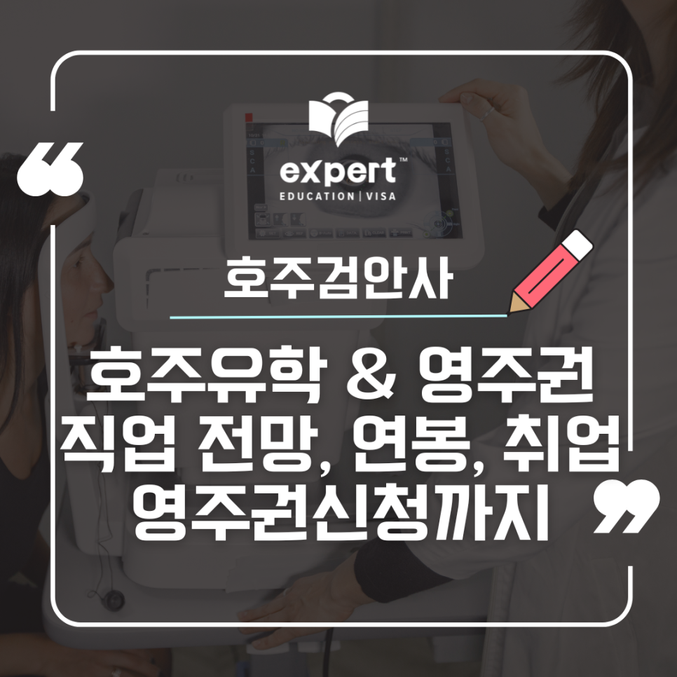 전 세계적으로 고령화가 가속화되고 디지털 기기 사용이 보편화되면서 눈 건강에 대한 관심은 그 어느 때보다 뜨겁습니다. 이러한 시대적 흐름 속에서 검안사는 미래 유망 직업으로 손꼽히고 있는데요. 특히 호주는 뛰어난 의료 시스템과 높은 복지 수준을 바탕으로 검안사의 수요가 5년 예상 증가율이 15.1%로 꾸준히 증가하고 있으며, 이는 유학생들에게도 매력적인 기회가 되고 있습니다. 호주대학교 검안학과 유학을 통해 전문성을 갖추고, 더 나아가 호주 영주권까지 신청할 수 있는 검안사의 직업 전망, 연봉, 고용 현황 그리고 영주권 신청에 대해서 안내해드리겠습니다.