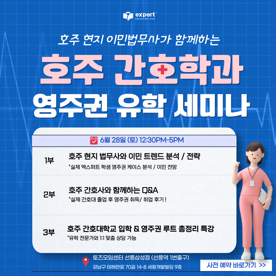 호주 간호학, 영주권 취득, 안정된 커리어까지 한 번에 잡고 싶다면? 엑스퍼트 유학이민 세미나에서 함께하세요.